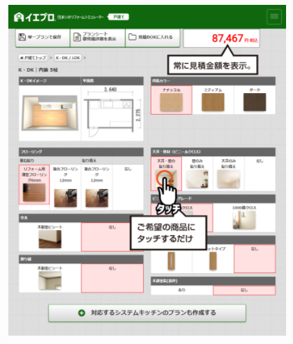PC・タブレット端末を利用し、リフォームの打合せ・プラン作成・見積書作成の時間を短縮できる次世代のリフォーム営業ツール。 次世代のリフォーム営業ツール スピーディーに打合せ・提案・見積書作成!
