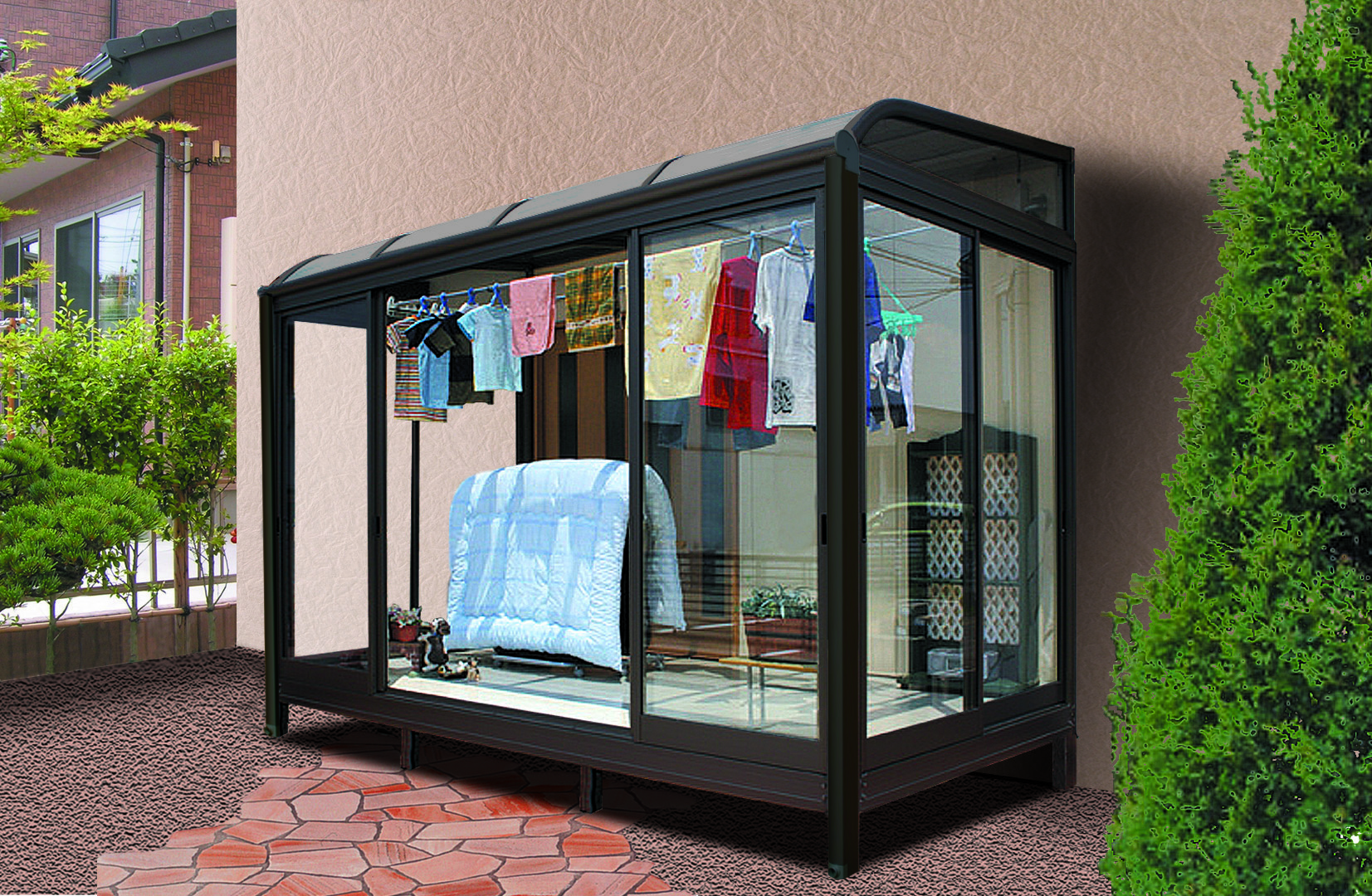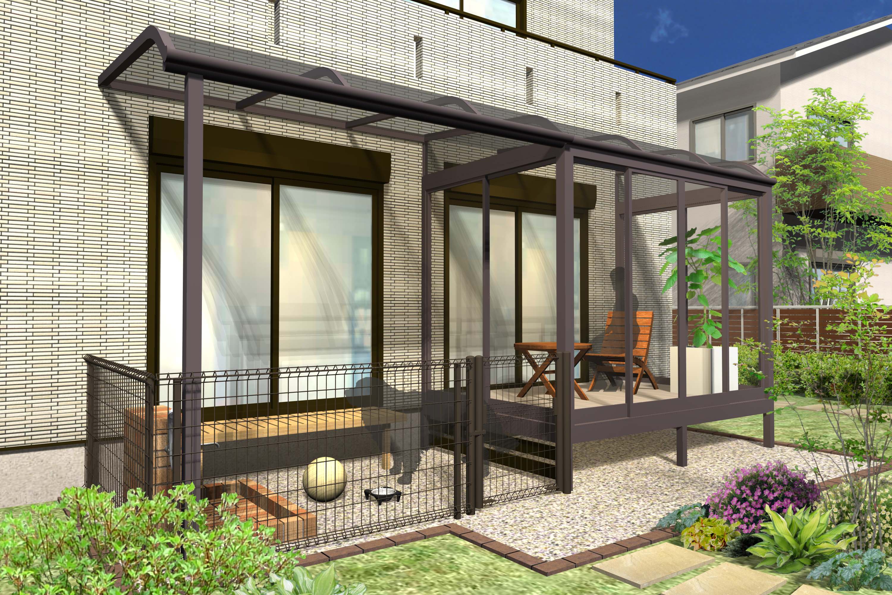 《 笑顔あふれる、新しい「光の空間」》 シンプルデザインのフレッシュルーフ5はお庭をやさしくリフレッシュ、のびのび快適なくらしづくりをお手伝いします。 豊富なバリエーションで、ライフスタイルに合わせ選ぶことができ、雨や風、花粉をシャットアウト。大切な洗濯物をお守りします。