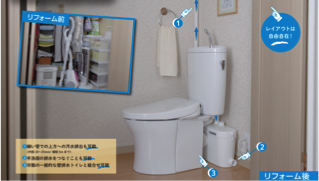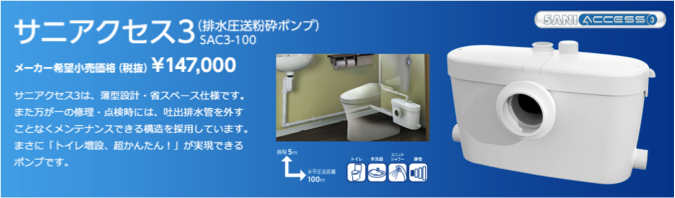 TOTOさんなどの市販の壁排水トイレの後ろにサニアクセス3をつなげば、流したお水を粉々に粉砕して、内径20㎜か25㎜の細い管で、上に5m、水平には100m圧送ができますので、建物の構造に影響を与えることなく、工期も短く、効率的な費用でトイレ増設が可能になります。