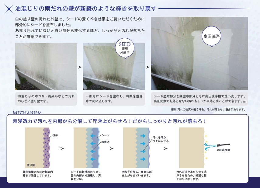 油混じりの雨だれの壁が新築のような輝きを取り戻す外壁塗り壁洗浄材「シード」です。