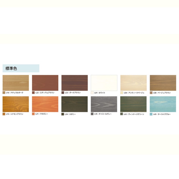 塗装選択色【カラー】L00:クリアオイル/L01:ホワイト/L16:ナチュラルオーク/L22:ミディアムブラウン/L23:ダークブラウン/L04:アンティークベージュ/L08:ベージュブラウン/L15:シナモンブラウン/L21:マホガニー/L24:エボニー/L35:チャコールグレー/L43:ヴィンテージグリーン/L45:ターコイズブルー