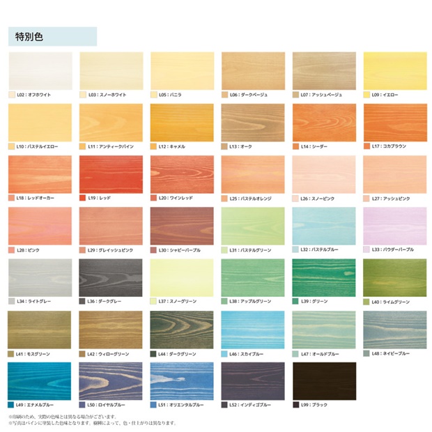 塗装選択色【カラー】L02:オフホワイト/L03:スノーホワイト/L05:バニラ/L06:ダークベージュ/L07:アッシュベージュ/L09:イエロー/L10:パステルイエロー/L11:アンティークパイン/L12:キャメル/L13:オーク/L14:シーダー/L17:コカブラウン/L18:レッドオーカー/L19:レッド/L20:ワインレッド/L25:パステルオレンジ/L26:スノーピンク/L27:アッシュピンク/L28:ピンク/L29:グレイッシュピンク/L30:シャビーパープル/L31:パステルグリーン/L32:パステルブルー/L33:パウダーパープル/L34:ライトグレー/L36:ダークグレー/L37:スノーグリーン/L38:アップルグリーン/L39:グリーン/L40:ライムグリーン/L41:モスグリーン/L42:ウィローグリーン/L44:ダークグリーン/L46:スカイブルー/L47:オールドブルー/L48:ネイビーブルー/L49:エナメルブルー/L50:ロイヤルブルー/L51:オリエンタルブルー/L52:インディゴブルー/L99:ブラック